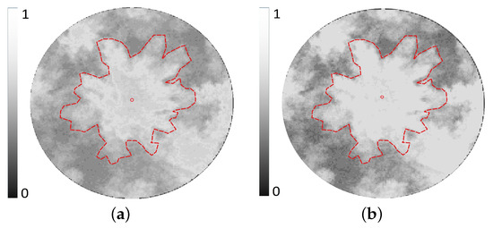The optimized fractional maps and represent the likelihood of a pixel to belong to the crown and the background class, respectively. Here, is identified as the one which has its mean spectral value most proximal to the mean spectral value of the reference-crown-class spectral value. The class membership associated with a class is often never zero, even in regions dominated by other classes. For example, the vegetation membership value associated with a soil pixel is not often zero. This low membership value is a source of noise and, hence, is undesirable for our analysis. Thus, we remove the undesirable variance in by assigning zero to all membership values where .