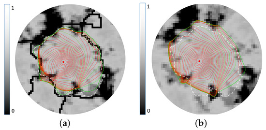 The crown delineation by the gradient vector field snake (GVF snake) on fractional images with and without ridge integration are shown in (a,b), respectively. A circular seed contour whose centre is placed at the treetop (red dot) is iteratively grown (red lines) using the GVF snake to detect crown boundary (dotted-green line). The reference crown boundary is shown in white-dotted lines.
