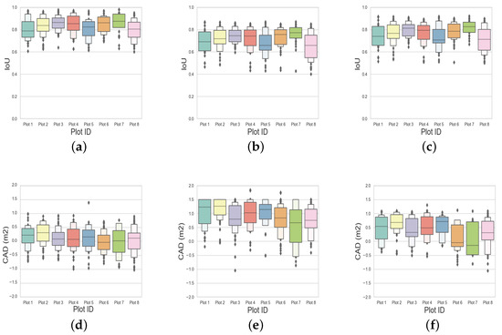 The intersection over union (IoU) and crown-area difference (CAD) distribution for all the trees in the eight circular plots are represented as boxplots for the spectral, spatial, and structural information-based individual tree crown delineation (a,d), the marker-controlled watershed segmentation (b,e), and the bias-field segmentation algorithm (c,f), respectively.