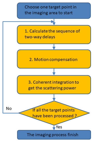 Generally speaking, the imaging process of the BP algorithm can be illustrated by the flowchart in Figure 1. The procedure is presented as follows: first, calculate the two-way delay between the radar position and the target point on the lunar surface at each PRT time; second, perform motion compensation on the signal samples at different PRT times corresponding to the delay; third, coherently integrate to obtain the target point scattering power; and last, cyclically process all target points in the whole imaging region to obtain an image. The BP algorithm does not have any theoretical approximation in principle, so the imaging effect is theoretically better than that of the RD algorithm. However, the pixel-by-pixel imaging calculation process renders this algorithm computationally expensive.