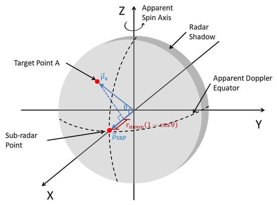 where is the corrected data matrix, is the range from the moon’s center of mass to the radar platform, and is the start time of the first PRT that receives the lunar echo. Second, all aligned PRTs are averaged along the slow time dimension to obtain one-dimensional, fast time sampling, and the fast time coordinate of the maximum echo intensity is detected as , which is considered the echo of the subradar point (SRP) at time . Third, the moon-fixed coordinate vector from the moon’s center of mass pointing to the SRP at is obtained as from the ephemeris. The latitude and longitude of target grid point A are also converted to a moon-fixed coordinate vector . Fourth, calculate the fast time coordinate of the echo from point A at time according to the observation geometry (shown in Figure 3):