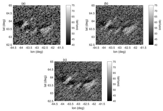 Imaging results of the Pythagoras crater region on the Doppler northern hemisphere of the front side of the moon. The imaging longitude range is 70.37°W~55.37°W. The latitude range is 56.24°N~71.24°N. The grid point step size is 0.02°. (a) Image obtained by the range-Doppler algorithm with a coherent integration time of 4 min. (b) Image obtained by the range-Doppler algorithm with a coherent integration time of 8 min. (c) Image obtained by the back projection algorithm with a coherent integration time of 8 min. The red rectangle on each image represents the magnified area shown in Figure 5.