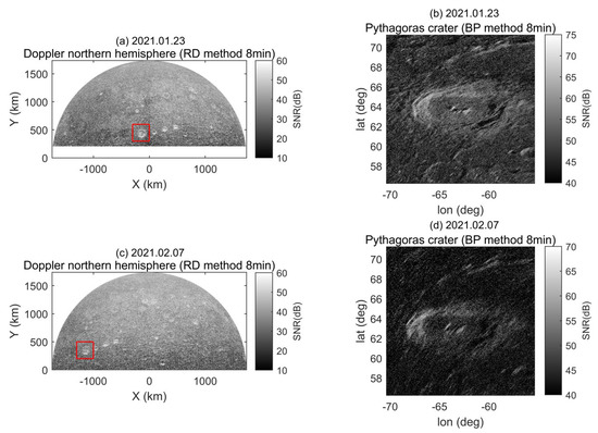Figure 5 shows that the noise speckle is obvious. The method of averaging multiple images in the same imaging area is usually adopted to suppress noise [4]. However, we did not adopt this method because the experiments were distributed on different days from January to March 2021 and the observation geometry of each imaging was different. As a result, for the same area of the lunar surface, such as the Pythagoras crater area, the resolution of the lunar surface for each imaging varies, which influences the averaging effect. Figure 6 can explain the problem more clearly and intuitively. Subfigures (a) and (b) show the results of the experiment on 23 January 2021, and subfigures (c) and (d) show the results of the experiment on 7 February 2021. The distribution of the lunar, front-side Northern Hemisphere image obtained by the RD algorithm on the Doppler equatorial plane is a semicircle, and the arc line is the Doppler equator. The closer the distance to the Doppler equator, the lower the resolution. The position of the Pythagoras crater on the Doppler equatorial plane (marked with a red rectangle) was significantly different between 23 January and 7 February and was closer to the Doppler equator on 7 February, which reduced the resolution of the crater image. This conclusion is evident from the comparison of the BP images of subfigures (b) and (d). Therefore, the averaging of images of different dates means the averaging of images of different resolutions. This averaging causes smearing and in turn affects the judgment of the imaging performance of the BP algorithm.