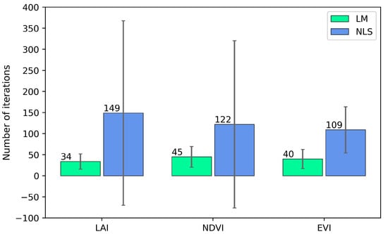 In this study, we found that the LM method was superior to the NLS method in fitting nonlinear models with remote sensing data on the GEE platform. The LM method converged faster and was less sensitive to initial values than the NLS method. In addition, the LM method also had a much greater convergence rate in our test area. This method has also been successfully used to fit nonlinear models in different fields. For example, Dkhichi et al. (2014) [43] found that the LM method could improve model fitting accuracy with a solar cell model. Franchois et al. (1997) [44] found that including the LM method into a 2D complex permittivity reconstruction model could considerably improve the model performance in reconstructing circular geometry around an object. Transtrum et al. (2012) [26] improved the LM method by accepting uphill steps and employing the Broyden method to update the Jacobian matrix. This improvement can reduce the number of iterations, but it increases the computational cost of the residual on the shift , which might not improve the overall computation efficiency. Ahearnetal et al. (2015) [45] compared the LM method with the MINPACK-1 method using multiple initial values and found that the MINPACK-1 method generally outperformed the LM method to find the global optimal using a small physiological dataset. For fitting long-time series remote sensing data at a global scale, the MINPACK-1 method with multiple initial values is not feasible due to gigantic demands of computation resources.