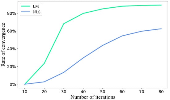 The LM method takes advantage of the steepest descent method, the Newton’s method and the Gauss–Newton method. The steepest descent method obtains the local optimal solution with first-order convergence and has no limitation on the initial values of parameters. The searching directions of any two consecutive steps are perpendicular and converge linearly in the final stage, reducing the searching efficiency. In addition, as the solution of the steepest descent method is not guaranteed to be a global optimal solution, it is often used in the initial optimization stage [16,17,18,19].