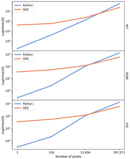 Comparison of the execution time of the Python and GEE platforms in fitting double-logistic models with a different number of pixels by using data from LAI, NDVI, EVI.