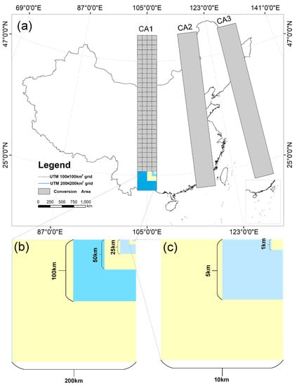 - Zhao, Q.; Duan, M.; Yin, C.; Qin, C. Rapid algorithm of raster map projection transformation. In Proceedings of the Second International Conference on Image and Graphics, Hefei, China, 31 July 2002; pp. 154–159. [Google Scholar]