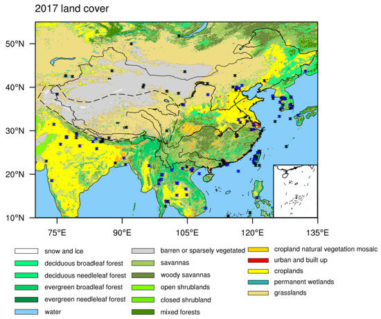 The distributions of land cover in East and South Asia in 2017. The asterisks represent the locations of AERONET sites with the blue asterisks indicating the 60 sites having enough valid data for analysis. The dash line is the contour of altitude of 3000 m.