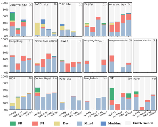 Figure 5 shows the percentages of five different types of aerosols (namely BB, U/I, dust, mixed, and marine aerosols) identified through the MD method in various sub-regions. It is evident that a large portion of aerosol is undetermined. The percentages of identified aerosol types as well as the undetermined ones vary remarkably in different sub-regions and seasons. Dust aerosols are dominant in summer in the NIGP area (34%) and in spring at the SACOL site (37%). The proportions of U/I aerosols in the Beijing area (15%), Hong Kong area (18%), Yangtze River Delta (24%), CIP area (18%), Hanoi area (10%), Taiwan area (25%), and Korea and Japan area (29%) are the largest in summer. A large amount of BB aerosols is identified in the CIP area especially in spring (35%) and winter (12%). Located at an agricultural and animal husbandry economic zone, the Ussuriysk site shows 24% of BB aerosols in spring which is attributed to vehicle transportation pollution and forest and agricultural vegetation fire [41,46]. Note that a large number of aerosols are identified as mixed aerosol type. This could be partially attributed to the way how the MD method classifies aerosols through establishing a representative training data set by using global observations. A previous detailed examination shows that the U/I aerosols in some cities in Asia are classified into mixed type, as they tend to be far from the centroids of the major aerosol types [17].