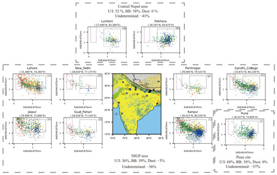 Figure 6 shows the clustering results for the sites in South Asia using the 2-D AAE-EAE method. The boxes drawn in each subplot correspond to the thresholds listed in Table 1 (Figure 2c). At the two sites (Lumbini and Pokhara, Figure 6a,b) in central Nepal, U/I aerosols are dominant in summer and BB aerosols are dominant in autumn and winter. The pollution sources are mainly local forest fire, fossil fuel combustion, crop residue burning, and the aerosols transported from the Northern Indo-Gangetic Plain (NIGP) area to Nepal [52,53]. Although Nepal (Figure 6a,b) is close to northern India, their aerosol classification results are different. In northern India, dust aerosols (Figure 6c–i) mainly exist in spring and summer and come from Thar Desert, Afghanistan/Iran, and the Middle-Eastern Peninsula to the MS 2 area (Figure 4) by the prevailing westerly winds [26,43]. The proportion of dust aerosols in summer are higher than that in spring. In the seven sites near northern India (Figure 6c–i), there is a significant negative correlation between EAE and AAE in spring and summer (passed the 95% confidence level) when EAE < 0.8. The EAE values of sites in northern India are overall lower than those in other sites over the whole study region. For example, the averaged value of EAE at the Jaipur site (Figure 6e) in summer is 0.4 which is the lowest among all sites.