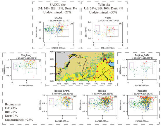 Figure 7 shows the aerosol clustering results at various sites in northern China using SSA and EAE as inputs to the 2-D classification method. The boxes drawn in each subplot correspond to the thresholds listed in Table 1 (Figure 2a). All the sites in Figure 7 belong to the MS 5 area. The northwest wind brings dust from the Taklimakan Desert, Inner Mongolia, and Mongolia arid regions (MS 7) to the MS 5 area [54]. At the SACOL site (Figure 7a), it is apparent to find dust aerosols in all seasons with the largest rate of occurrences in spring (30%), and the U/I aerosols prevail in the other seasons. It is found that quite a few data samples with medium sizes are un-classified as either dust or fine-mode aerosols in every season. The Yulin site shows much lower SSA value because of the black carbon emission from nearby enterprises that produce coal, chemical, oil, and gas [55].