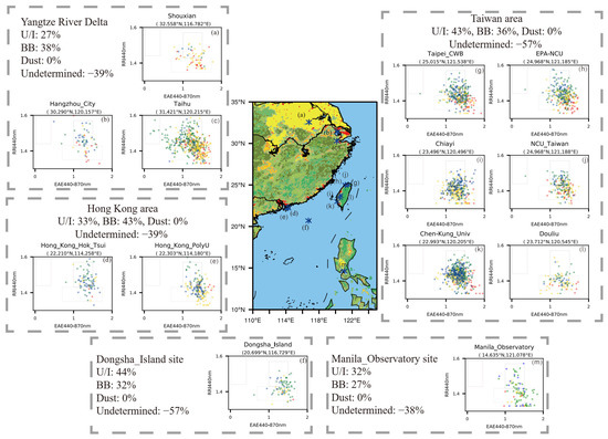 Figure 8 shows the results of aerosol classification in southeast Asia using the 2-D method with RRI and EAE. The boxes drawn in each subplot correspond to the thresholds listed in Table 1 (Figure 2b). It is found that the BB and U/I aerosols are the major aerosol types within this sub-region. The U/I aerosols in summer and autumn are dominant in Shouxian site (Figure 8a), Taihu site (Figure 8c), and Taiwan area (Figure 8g–l). The proportion of BB aerosols in Taiwan in spring ranges from 23% to 54%, which is largely affected by the BB aerosols transported from IP region as is elaborated in some previous studies [3,61]. There is basically no local emission from biomass combustion in Hong Kong, thus the source of BB aerosols is also attributed to the long-range transport from the Indochina Peninsula and Philippines [62,63]. Among the sites shown in Figure 8, the averaged EAE value at the Yangtze River Delta sites is lowest, especially at the Taihu site during spring. The result in the Taihu site (Figure 8c) shows sporadic dust aerosols in spring, which is related to the impacts of aerosol long-distance transport from the northwest of China [64].