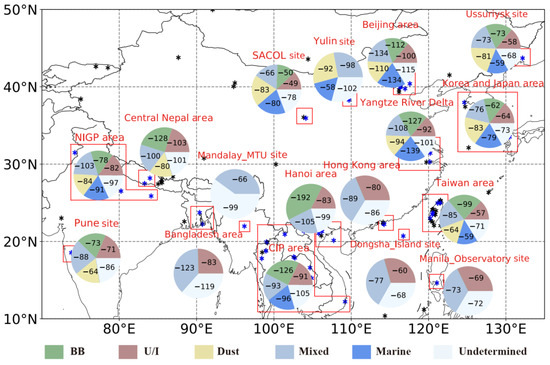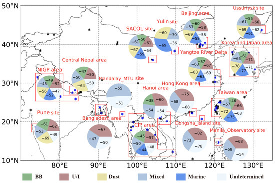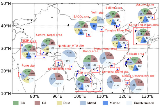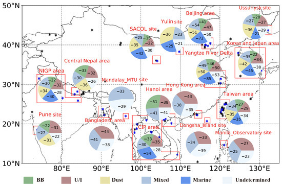 It is interesting to find that our aerosol classification results only show limited fractions of pure marine aerosols even at the coastal sites near Bohai Bay, Yangtze River Delta, Taiwan, and Hong Kong. This is contrary to the previous results at the coastal sites over the world where marine aerosols are predominant in different seasons [47,48]. Some occurrences of BB aerosol are found over the Yangtze River Delta which are similar to those in the Baikal region [49] but in a different season (winter). We also found much higher percentages of mixed aerosols but lower percentages of U/I aerosols than those at the other coastal sites [50,51]. This is mostly attributed to the use of different classification methods.