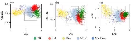 Figure 2 shows a schematic diagram of the 2-D clustering approaches explaining how the aerosol types are determined. The sample points that fall into the boxes are regarded as belonging to the corresponding aerosol types of dust, U/I, or BB. As the EAE is an indicator of particle size [22], the dust aerosols with relatively large particle sizes are conveniently separated from the fine-mode aerosols. For BB and U/I aerosol particles that are similarly small in size, they can be separated by AAE, RRI, or SSA which signify their absorbing capabilities [9,33]. Note the data samples that fall within the overlapped boxes (Figure 2a,c) are both counted as U/I or BB aerosols accordingly as well. This is a drawback of the 2-D method since it is confusing that those aerosol types could not be uniquely derived.