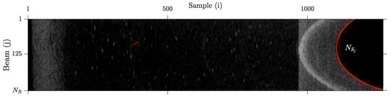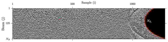 After describing the structure of MWC datagrams, it is clear that from Figure 1 is the number of beams contained in RxInfo, and is the number of samples contained in BeamData. We remark that the number of samples per beam changes along the ping, which means that typical image compression algorithms cannot be easily applied to this kind of data. In Figure 2 and Figure 3, we illustrate, respectively, a raw representation of water column amplitude samples and the variability of the number of samples per ping.