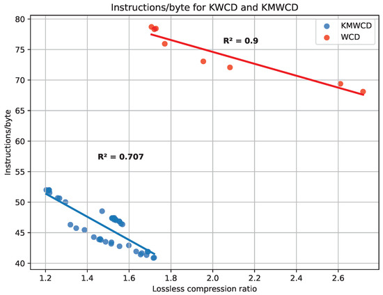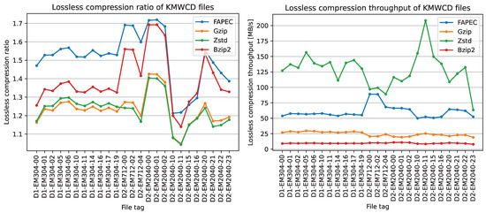Lossless compression ratio (left panel) and lossless compression throughput (right panel) for the tested KMWCD files.