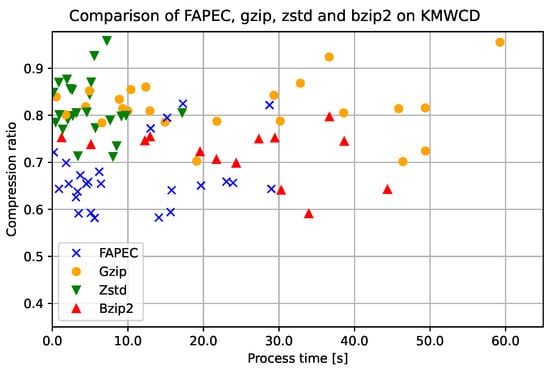 The performance of FAPEC in KMALL files is even better than that in KMWCD files. It is at least 28% better than bzip2 and 35% on average. In this case, bzip2 does not outperform gzip and Zstd, and all three exhibit similar performance in terms of ratio.