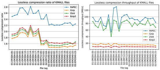 Lossless compression ratio (left panel) and lossless compression throughput (right panel) for the tested KMALL files.