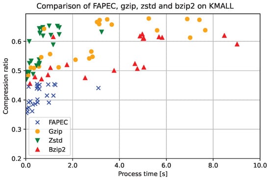 Comparison of lossless compressors showing that FAPEC performs better both in time and ratio than gzip, Zstd and bzip2 on KMALL files.