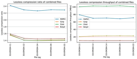 It is worth mentioning that we also carried out these tests on a Raspberry Pi 400 platform, featuring an ARM processor running at 1.8 GHz, to evaluate the compression speeds of the various solutions. Here, FAPEC is undoubtedly the fastest data compressor, either in these combined files or in the separate ones, reaching compression throughputs of 35 to 75 MB/s, whereas the other compressors can barely reach 10 MB/s.