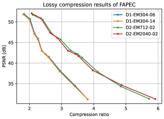 The PSNR is usually evaluated in decibels (dB), with typical values between 30 and 50 dB (where higher is better) for 8-bit samples, as in our case. Figure 14 shows the relationship between different PSNR results at a given lossy level. It is worth mentioning that the near lossless approach followed implies that the PSNR values obtained with FAPEC for any file are grouped around some specific values. Note that this statement is only true if the files contain the same data types. That is, files with phase samples and files without phase samples are not comparable (see Figure 14) between them, as both the applied algorithm and the data structures differ.