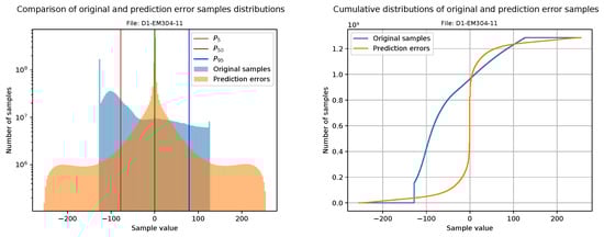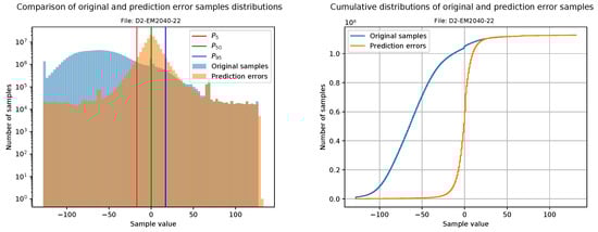 This section is focused on evaluating the goodness of compressible data after the decorrelation stage. Our first approach is to plot a histogram of the original samples together with a histogram of the prediction errors (i.e., the values that will be sent to the FAPEC entropy coder). For a better visualization, the bin width is calculated from the number of samples, and it is the same for both histograms. In addition, the prediction errors histogram also includes three vertical lines at percentiles 5, 50 and 95 in order to clearly show the range where 90% of the data is contained.