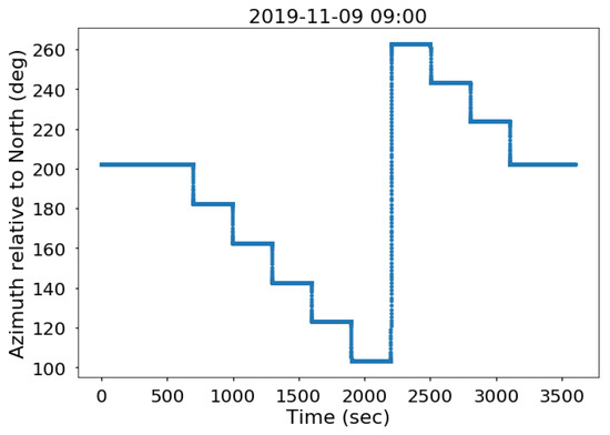 Example of the KaBODS nominal azimuth positions within one hour cycle. The data correspond to 9 November 2019, starting at 09:00 a.m. The time is shown as the time in seconds since the beginning of the cycle.