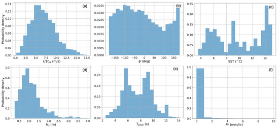Probability density of (a) equivalent neutral wind speed , (b) relative wind direction , (c) sea surface temperature SST, (d) significant wave height , (e) peak wave period and (f) precipitation rate .
