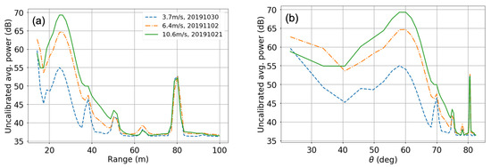 Uncalibrated power with respect to radar range (a) and incidence angle (b). Data corresponding to three different wind speed conditions are shown: 3.7 m/s (dashed-blue), 6.4 m/s (dot-dashed orange) and 10.6 m/s (solid green).