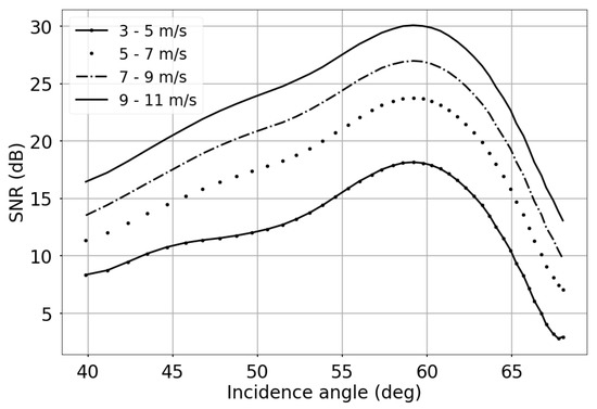 Signal-to-noise ratio (SNR) with respect to the radar incidence angle for different wind speed ranges: 3–5 m/s (dot-solid), 5–7 m/s (dot), 7–9 m/s (dot-dashed), 9–11 m/s (solid).