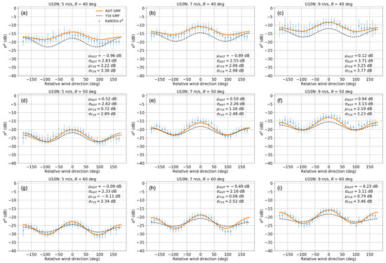 We first analyzed the sensitivity of the KaBODS backscatter with respect to the wind speed and compared results for the ASIT GMF with the KaDPMod GMF. Figure 6 shows the KaBODS <σ°> binned over 1 m/s range (blue dots with error bars) along with the ASIT GMF (solid orange line) and the KaDPMod GMF (dashed black line) as a function of the wind speed. The results are shown for (upwind), (crosswind), and (downwind), at three different incidence angles, 40°, 50° and 60°. The KaBODS measurements are modulated by the wind speed and the ASIT GMF is able to describe this wind sensitivity with a residual absolute mean bias () ranging between 0.15 dB to 0.95 dB and a residual standard deviation () between 1.96 dB and 3.17 dB for relative wind directions up to 150°. These values were calculated as the mean bias and the standard deviation of the differences between the model and the actual measurements in log space. In downwind direction, the agreement between the ASIT GMF and the measurements is not as good as at 150°. This could be ascribed to the fact that the ASIT GMF has not been trained at this angle, as explained in the previous section. However, this could also be an indication of the potential shadowing effects. In addition, a disagreement is observed for wind speeds higher than 12 m/s, mostly due to the lack of data used to train the GMF at high wind speed conditions.