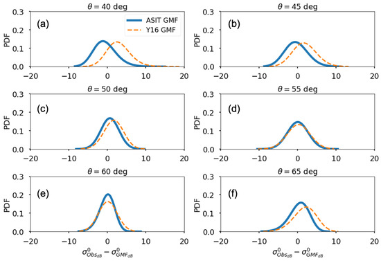 The GMF residual distribution at six incidence angles: 40°(a), 45° (b), 50° (c), 55° (d), 60° (e) and 65° (f), for the ASIT GMF (solid line) and KaDPMod GMF from Yurovsky et al. (dashed line).
