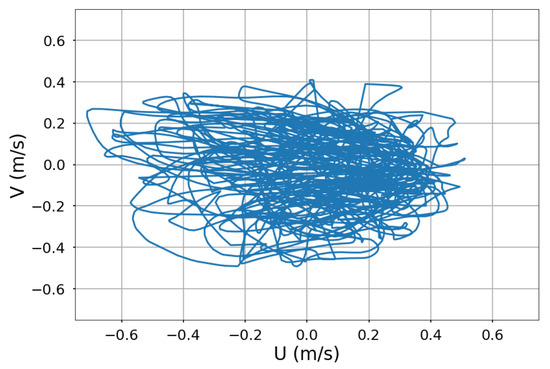Time plot of the horizontal (U) versus the vertical (V) velocity components obtained from the ADCP located near the ASIT.