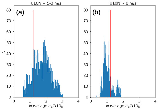 Wave age distribution for wind speeds ranging between 5–8 m/s (a) and >8 m/s (b). The red line indicates a wave age value of 1.2.