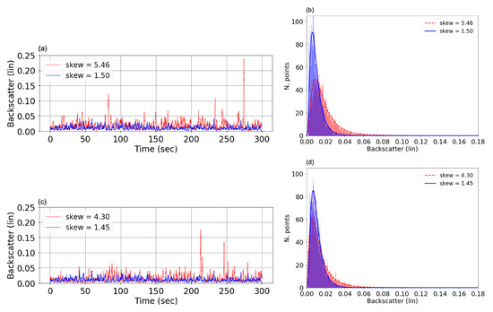 KaBODS backscatter time series (left) with the corresponding distributions in linear space (right). Data without large spikes are shown in blue, whereas the data corresponding to possible breaking events are shown in red. Data corresponding to two different wind speed conditions are considered: 8–9 m/s (a,b) and 6–7 m/s (c,d), both in the upwind direction. (a,b) Data from 2019.10.23T03 (blue) and 2019.12.14T01 (red). (c,d) Data from 2019.11.15T13 (blue) and on 2019.12.22T15 (red).