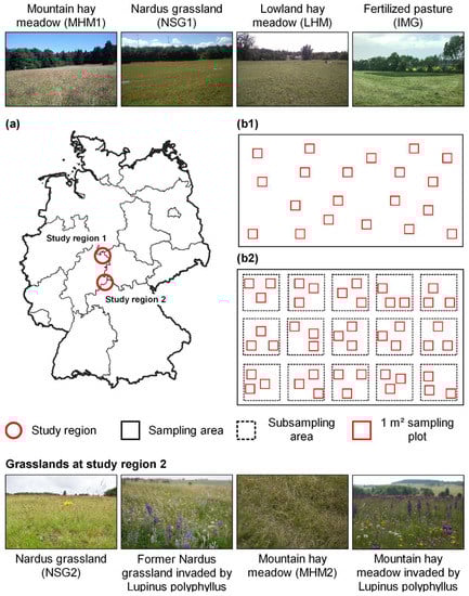 (a) Location of study regions 1 and 2 in Germany. (b1) Sampling design for biomass sampling at study region 1. (b2) Sampling design for biomass sampling at study region 2. The photos depict the grassland composition at all grassland sites at study region 1 (top) and 2 (bottom).