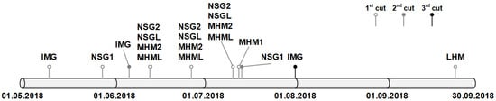 In all sampling plots (n = 320), the grassland biomass was cut 5 cm above ground level (AGL), and the fresh matter yield (FMY) was weighted directly in the field. A representative biomass subsample was subsequently dried for 48 h at 105 °C, with the dry matter yield (DMY) being calculated subsequently. The biomass sampling was conducted at different dates throughout the growing season in 2018 (Figure 2).