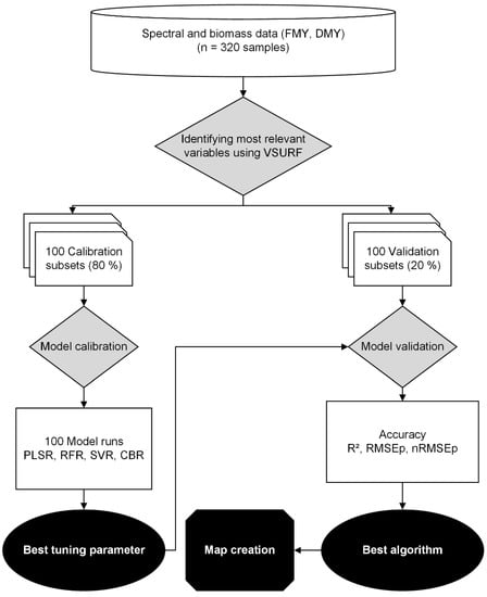 ML methods were employed due to their ability to handle multicollinear data, such as the contiguous bands of hyperspectral data. The following well established and frequently used ML methods were evaluated for their modeling performance: partial least squares regression (PLSR), support vector regression (SVR), random forest regression (RFR) and Cubist regression (CBR). PLSR is an algorithm searching for a set of latent variables, which represent the covariance between the explanatory variables (i.e., selected waveband) and the response variables (i.e., biomass) best. Latent variables are only added to the model if the error is reduced. The maximum number of latent variables was limited to 20 to reduce the effect of overfitting. SVR is a kernel-based statistical approach, which uses a radial basis function to fit the data to a hyperplane []. SVR is beneficial for fitting complex non-linear data. The optimal model was identified using a systematic grid search, tuning the cost and sigma parameter []. RFR, a tree-based ensemble learning technique, combines the information from many variables. In this study, the number of trees was kept at 500 [] independent decision trees []. For identifying the optimal model, the parameter mtry (defining the number of randomly selected variables at each split in the regression tree) was tuned. The minimum node size was kept at five []. CBR is a rule-based regression technique that retrieves a set of rules with sets of multivariate models [,]. The best model selection is based on rules that best fit an explicit set of predictors [,]. For tuning the CBR model, the best combination of the parameter’s committees and neighbors were searched. The model building process was carried out using the caret package (version 6.0.85) [] in statistics software R. Spectral data and the target variables FMY and DMY were utilized as input for the modeling process (Figure 3).