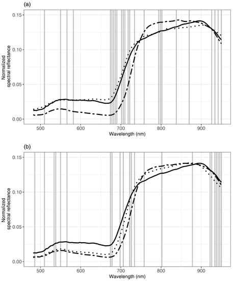Normalized spectral reflectance curve for the minimum (solid), maximum (two dashes) and median (dotted) yield values of (a) fresh matter yield and (b) dry matter yield. The gray lines in the background show the selected most important wavebands used for the model calibration (n = 25 and 23 for FMY and DMY).
