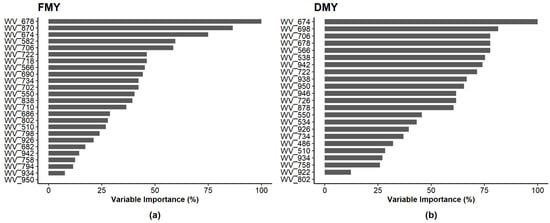 Variable importance of single wavelengths (“WV_XXX”, given in nanometers) as selected by variable selection using random forests (VSURF) for (a) FMY and (b) DMY modeling with CBR. A total of 25 and 23 variables were selected for FMY and DMY, respectively.