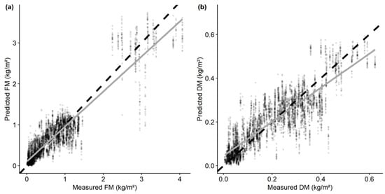 Observed vs. predicted plot from CBR model for FMY (a) and DMY (b). A dashed black line represents the 1:1 line. A gray line represents the linear regression line. Duplicates of points in vertical direction result from 100 model runs (100 predictions).