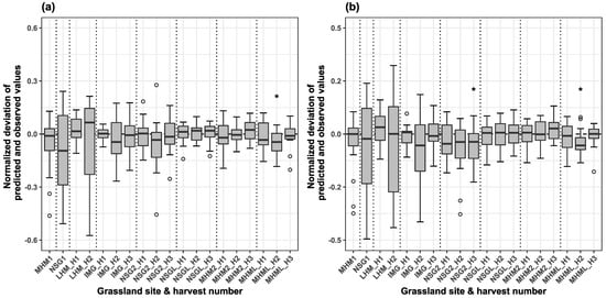 Normalized deviations of predicted from observed values based on the final selected Cubist model for (a) fresh and (b) dry biomass yield. Harvest numbers are given after the grassland suffix by “H1–H3”. Different harvests of one grassland are arranged between dotted vertical lines. Significant differences (α = 0.05) in the mean deviation for each grassland from zero based on the Wilcox-test are indicated by a star (*).