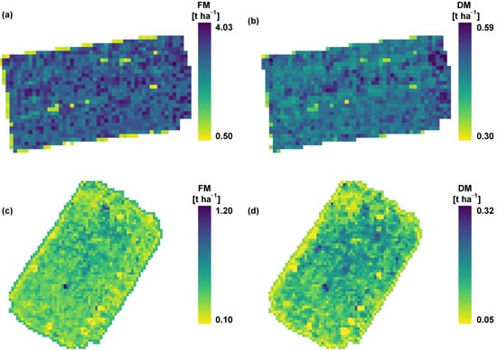 Maps produced utilizing the best CBR model and the best tuning parameters (committees = 95 and 96, neighbors = 3 and 4 for FMY and DMY, respectively) for (a) FMY and (b) DMY of an intensively used grassland (IMG, 1st harvest) and (c) FMY and (d) DMY of an extensively used grassland (MHM1, 1st harvest). The scale bar was adjusted for each map to highlight the spatial variability.