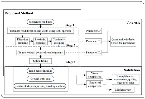 The general scheme of proposed approach is summarized in Figure 1, together with the diagrammatic sketches of the validation and analysis processes. Starting with a segmentation result of road pixels from the remote sensing images, a three-stage procedure for road centerline extraction is presented. The segmented road binary map contains information of road shape, edges, and widths. We aim to detect the road centerline automatically from the road binary map obtained by different methods. In this paper, the road segmentation method in [16] is applied for obtaining optical images, the method in [17] is used to obtain SAR images, and the hand marking method is also applied. Then, the presented centerline extraction procedure is described by means of three stages, which are (1) using a ratio of cross (RoC) operation to derive road orientation and width; (2) clustering road pixels based on three perceptual grouping principles; and (3) extracting control points and generating the road centerline map by spline fitting. It can also be observed that the proposed method is validated visually and numerically by comparing extraction results with ground truth data. Notably, the McNemar test is applied to measure the differences of extraction results using different approaches. For the analysis, the effects of three key parameters on the accuracy of the extraction results are discussed in detail.