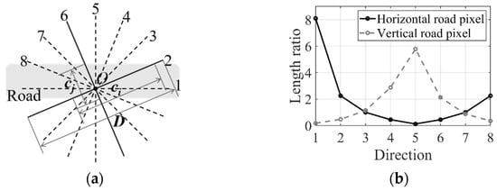 RoC detector. (a) Sketch map of RoC detector (N = 8). (b) Length ratios for sampled horizontal and vertical road pixels at different directions.