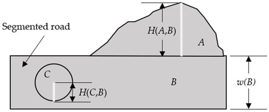 A sketch map for the Hausdorff distance where A, B, and C represent three different road clusters, and w(B) is the mean value of width feature for all pixels in B.