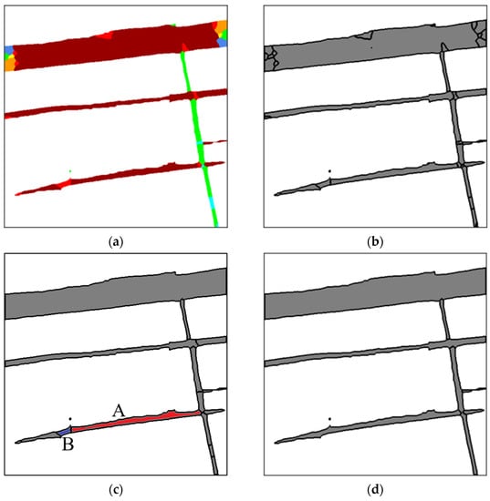 where and denote the length of the line covered by road pixels at the direction and which are perpendicular to each other. Then, the width of the current center pixel is estimated by where . In the case of shown in Figure 2a, it can be inferred that is the maximum value of and thus direction 1 will be the detected direction for road pixel . In the implementation, the value of can be estimated using image convolution with a linear structuring element towards a specific direction. Figure 2b presents the length ratios at a different direction for two test road pixels which belong to horizontal and vertical road segments, respectively. It has been proven that the maximum length ratio is able to highlight the orientation of sampled road pixels. Furthermore, Figure 3 shows an example of the application of the RoC detector. The colored areas in (a), (b), and (c) of Figure 3 correspond to road regions. Different directions and width values derived from RoC detectors are labelled with different colors. Considering that a pixel belonging to a direction is likely to have neighboring pixels belonging to the same direction, a Markov random fields (MRF) [18] framework is applied to the original direction map for de-noising (i.e., obtaining a “cleaner” road direction map). Figure 3b presents the de-noising result which uses Figure 3a as an initialization.