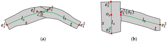 - In the case that and have no intersection points, determine the two closest points between and first. If and , add the point to the set and . Conversely, if and , put the point into the set and . For all other cases, the midpoint between and is the determined connection node and is added to the sets and .