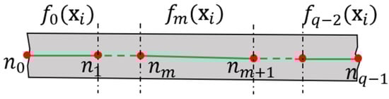 Once the final nodes are achieved, road centerlines are extracted based on the spline fitting. Let represent sorted nodes in a cluster according to pixel rows or columns. Supposing that where is the polynomial function denoting the curve between nodes and , each curve must be made to pass through its nodes and minimize the residual sum of squares (RSS), i.e.,