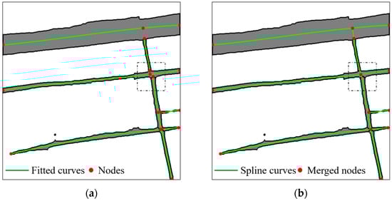 Figure 8 presents an example for the proposed centerline extraction method. In Figure 8a, the fitted polynomial curves on each road cluster are labelled as green lines and the extracted nodes are marked with red dots. As shown in Figure 8b, nodes in the dashed box are merged into one node using the agglomerative hierarchical clustering method. Figure 8b also shows the final centerlines passing through merged nodes in the image based on the proposed spline fitting method.